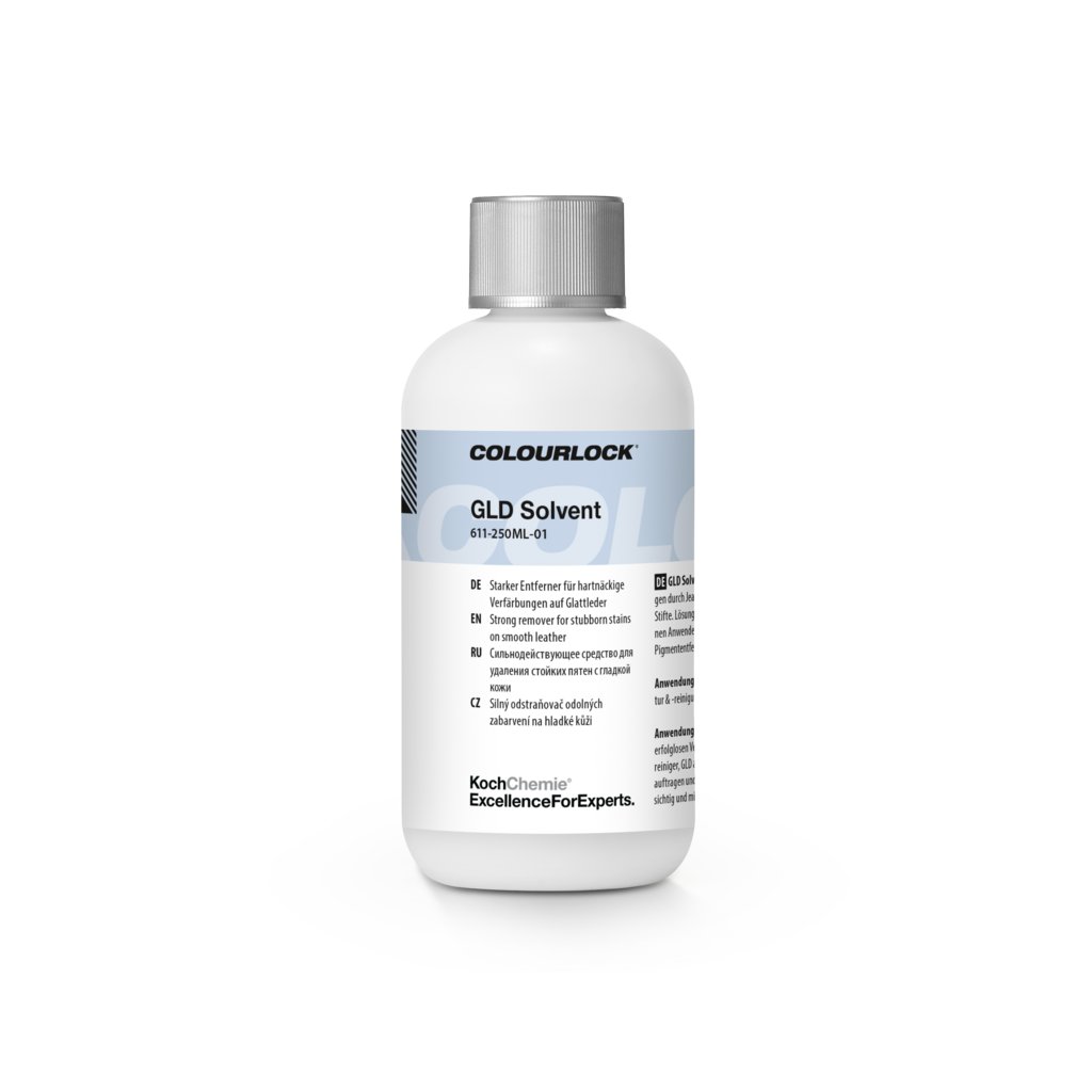 COLOURLOCK GLD‑Solvent 250 ml je vysoko účinné rozpúšťadlo určené na odstránenie odolných pigmentových zafarbení kože (napr. od džínsov, pásov, tašiek alebo atramentu), ktoré bežné čističe nedokážu odstrániť.