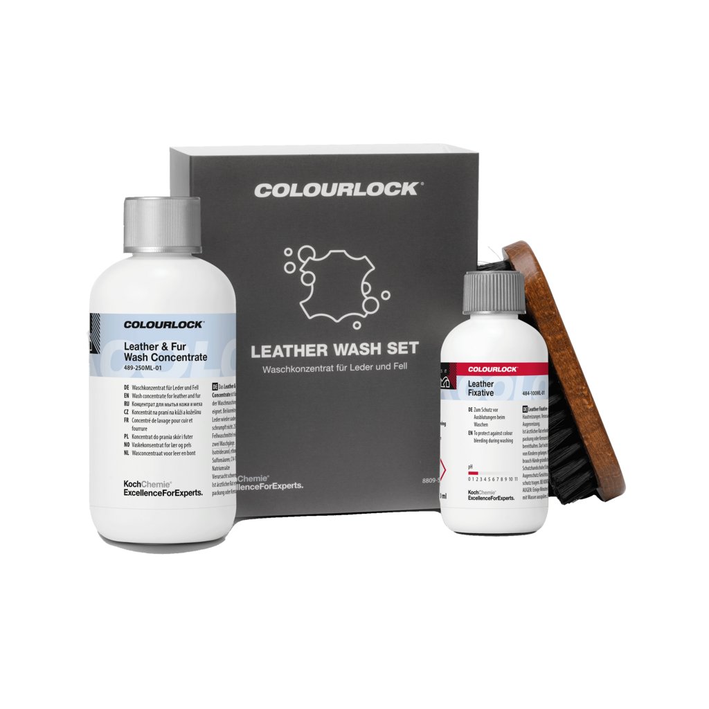 COLOURLOCK Leather Wash Set je profesionálna kombinácia fixačného prostriedku a špeciálneho pracieho koncentrátu. Táto súprava je navrhnutá tak, aby bezpečne a efektívne vyčistila takmer všetky druhy koží a kožušín pri zachovaní ich prirodzenej jemnosti a tvarovej stálosti.